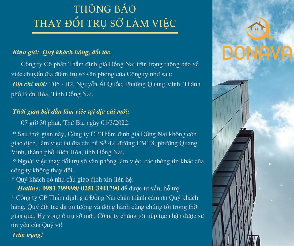 Công ty Cổ phần Thẩm định giá Đồng Nai trân trọng thông báo về việc chuyển địa điểm trụ sở văn phòng của Công ty:
