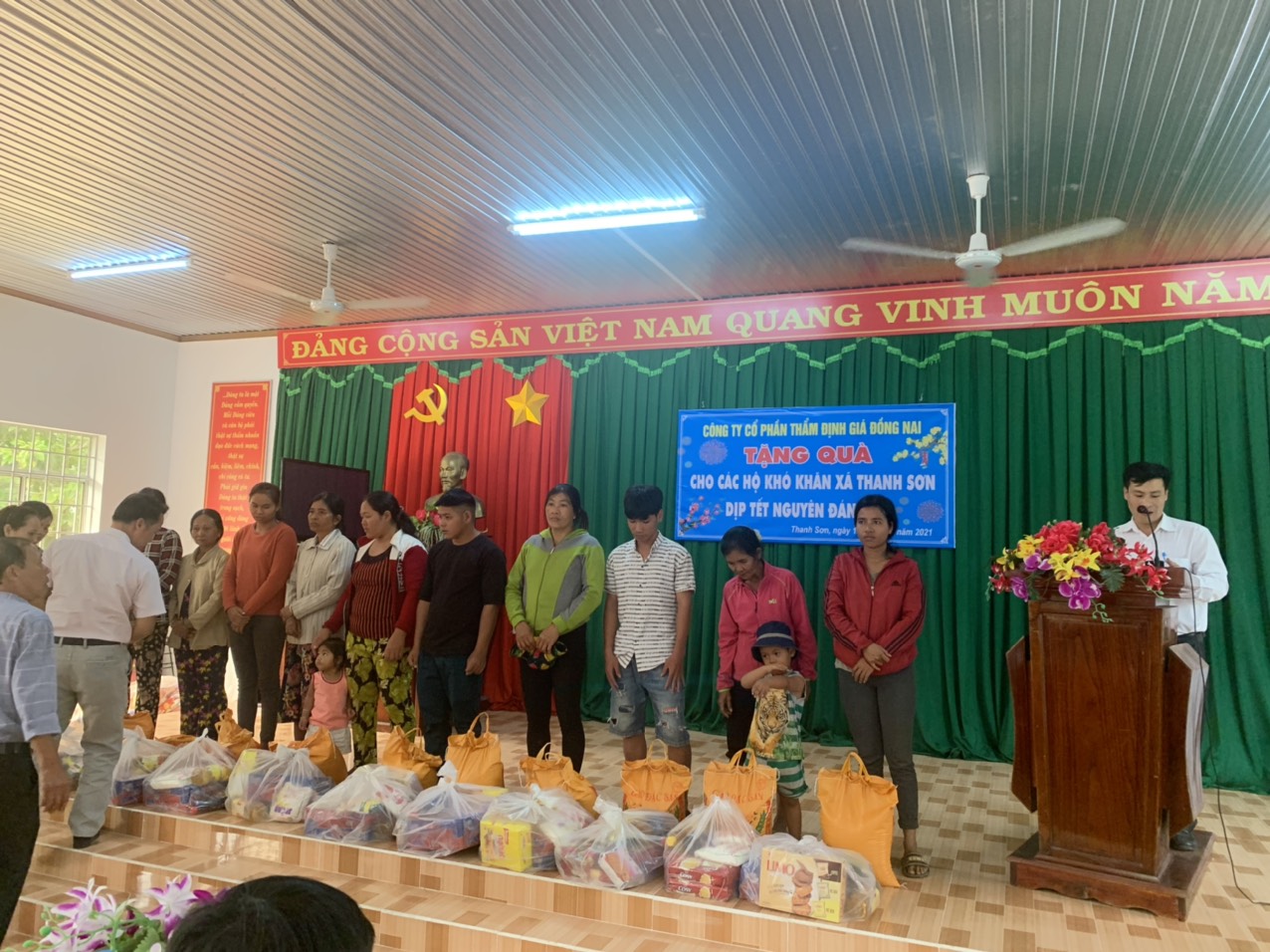 Ngày 20/01/2021 vừa qua, tập thể Công ty CP Thẩm định giá Đồng Nai đã trực tiếp xuống thăm hỏi và trao các phần quà Tết đến các hộ gia đình và các em học sinh có hoàn cảnh khó khăn tại địa bàn các xã Thanh Sơn (Định Quán), Xã Xuân Mỹ (Cẩm Mỹ), xã Xuân Thọ (Xuân Lộc), Trường THCS Phương Lâm (Tân Phú).